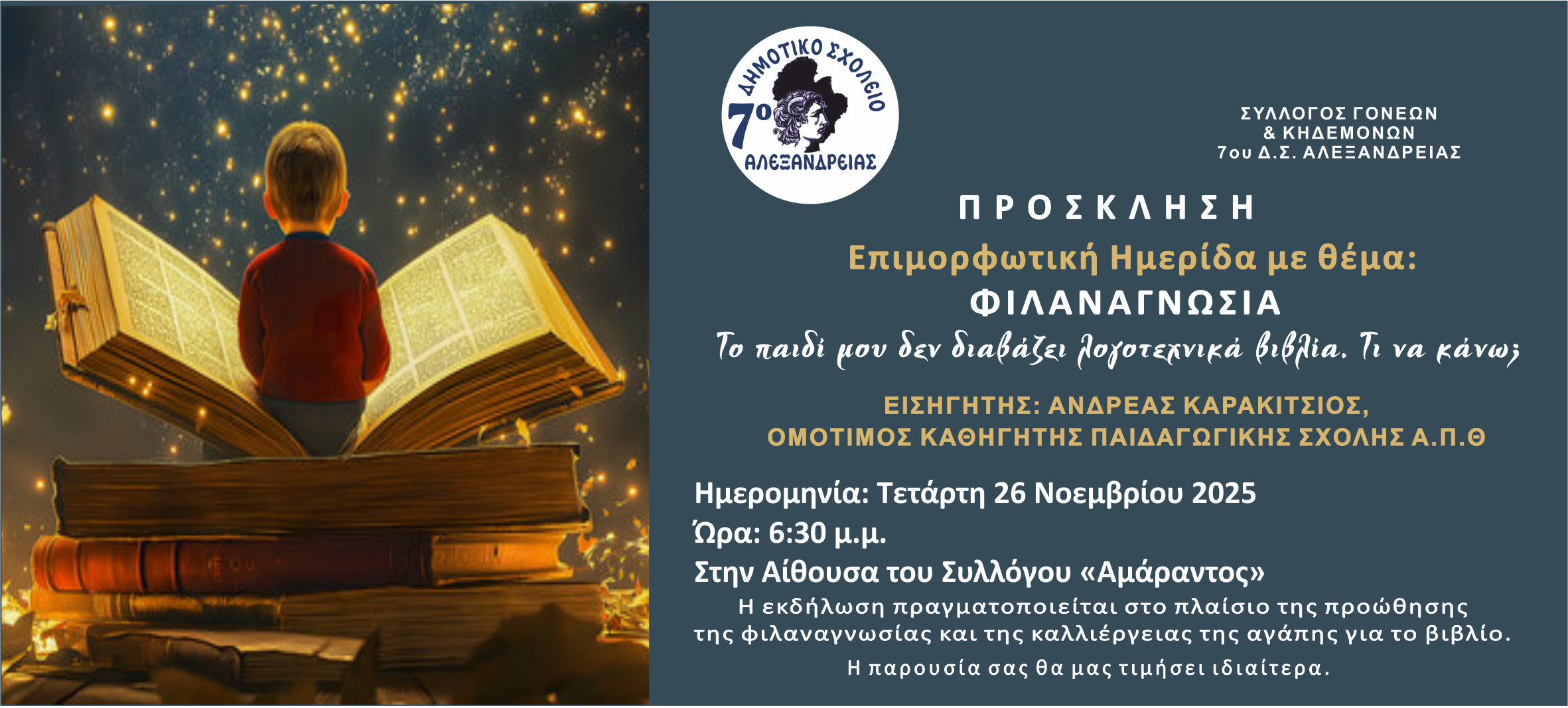Ο Σύλλογος διδασκόντων του 7ου Δημοτικού Σχολείου Αλεξάνδρειας και ο Σύλλογος γονέων και κηδεμόνων αποφάσισαν να πραγματοποιήσουν επιμορφωτική ημερίδα με στόχο την προώθηση της φιλαναγνωσίας και την καλλιέργεια της αγάπης για το βιβλίο.