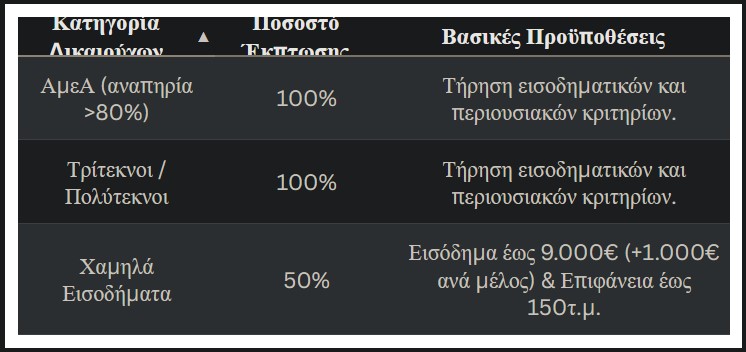• Όριο αξίας: Για ακίνητα με αντικειμενική αξία άνω των 500.000 ευρώ, η μέγιστη έκπτωση περιορίζεται στο 10%.
