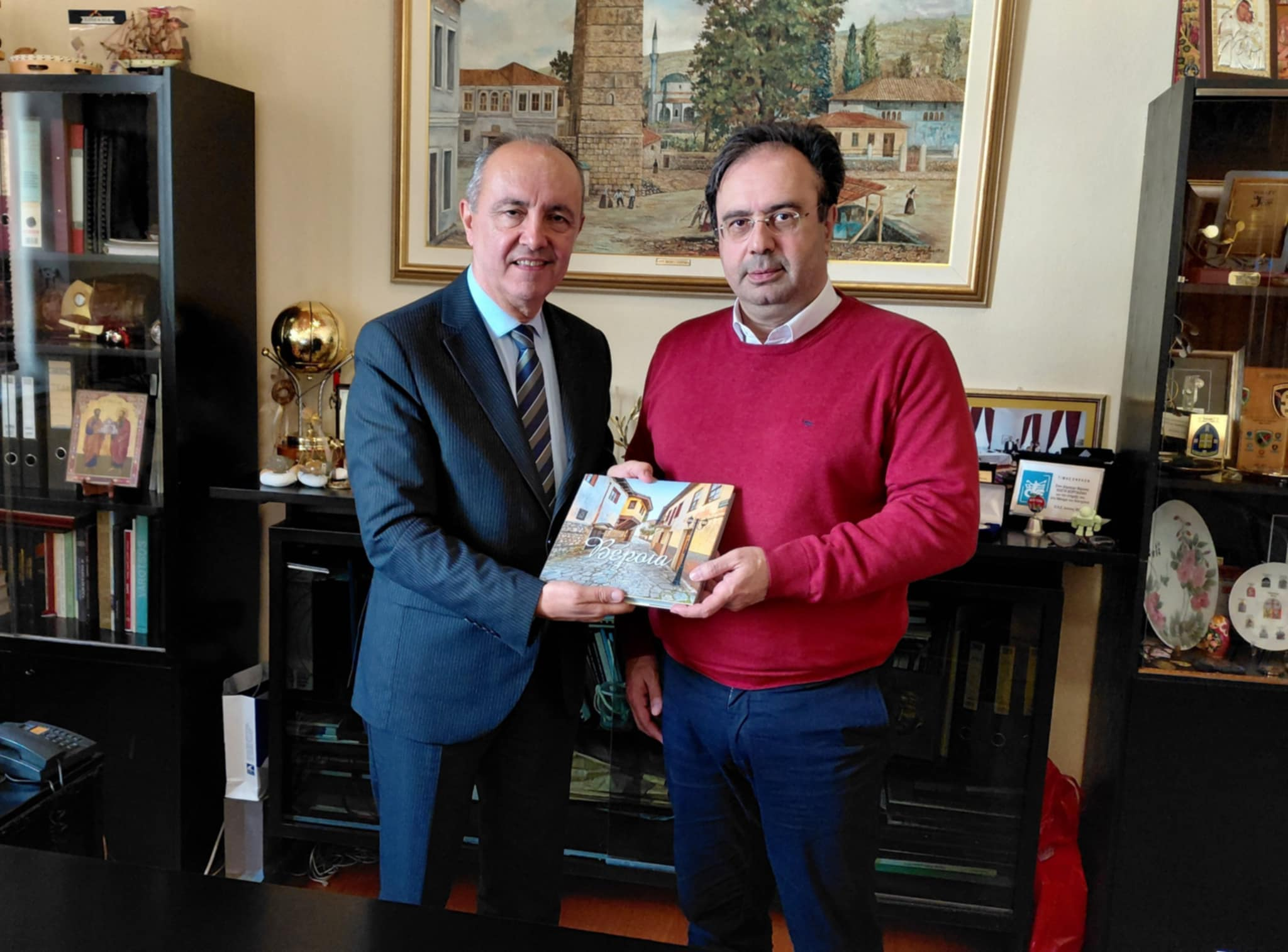 Μετά το πέρας της συνάντησης, στην οποία συμμετείχαν οι αντιδήμαρχοι κ.κ. Ηλίας Τσιφλίδης, Καλλίστρατος Γρηγοριάδης και Κώστας Βασιλειάδης, ο Δήμαρχος δώρισε στον κ. Καράογλου το λεύκωμα της Βέροιας.