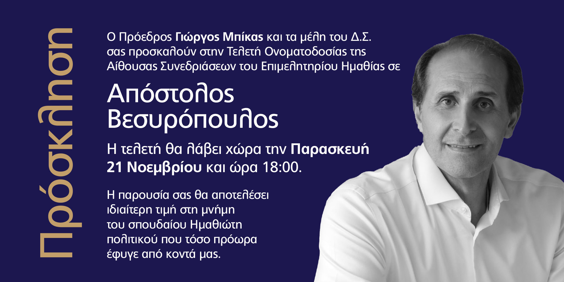 Ο Πρόεδρος Γιώργος Μπίκας και τα μέλη του Δ.Σ. σας προσκαλούν στην Τελετή Ονοματοδοσίας της Αίθουσας Συνεδριάσεων του Επιμελητηρίου Ημαθίας σε Απόστολος Βεσυρόπουλος