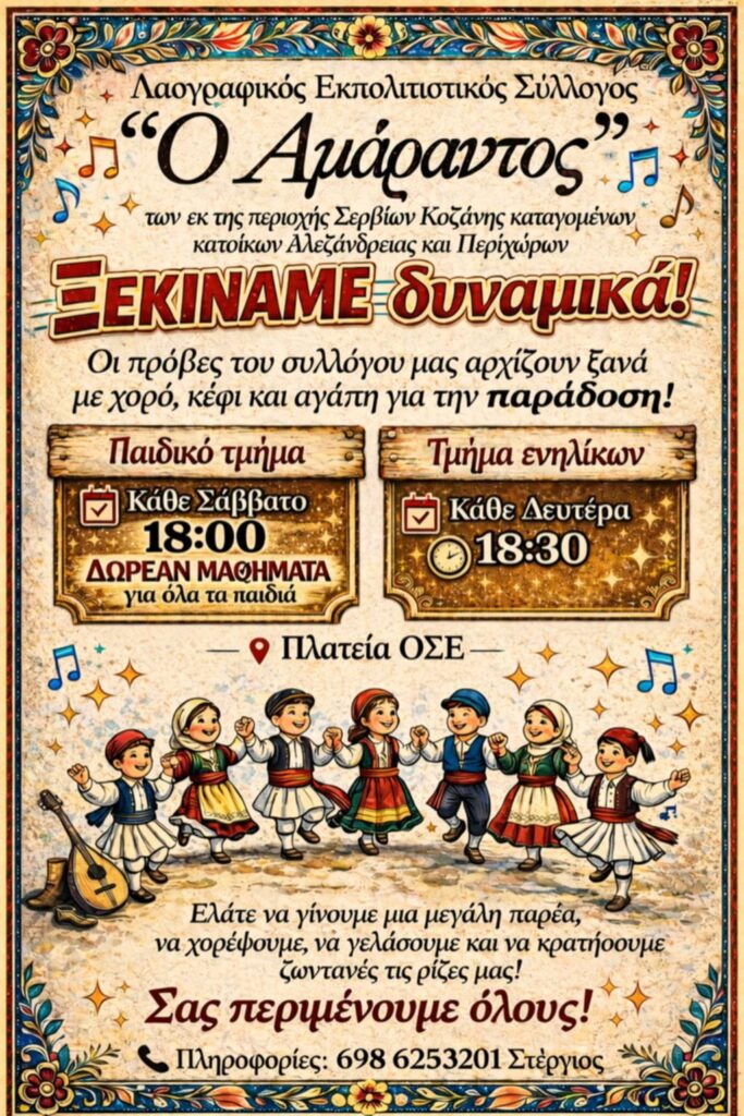 Την επανέναρξη των δραστηριοτήτων του ανακοινώνει ο Λαογραφικός Εκπολιτιστικός Σύλλογος «Ο Αμάραντος», καλώντας μικρούς και μεγάλους να συμμετάσχουν ενεργά στις πρόβες και τα τμήματά του, με επίκεντρο την παράδοση, τον χορό και τη συλλογική δημιουργία.